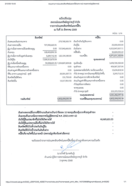 รายการย่อแสดงสินทรัพย์และหนี้สิน ประจำปีบัญชี 2568 สหกรณ์ออมทรัพย์ครูราชบุรี จำกัด ในเดือนต่างๆ |