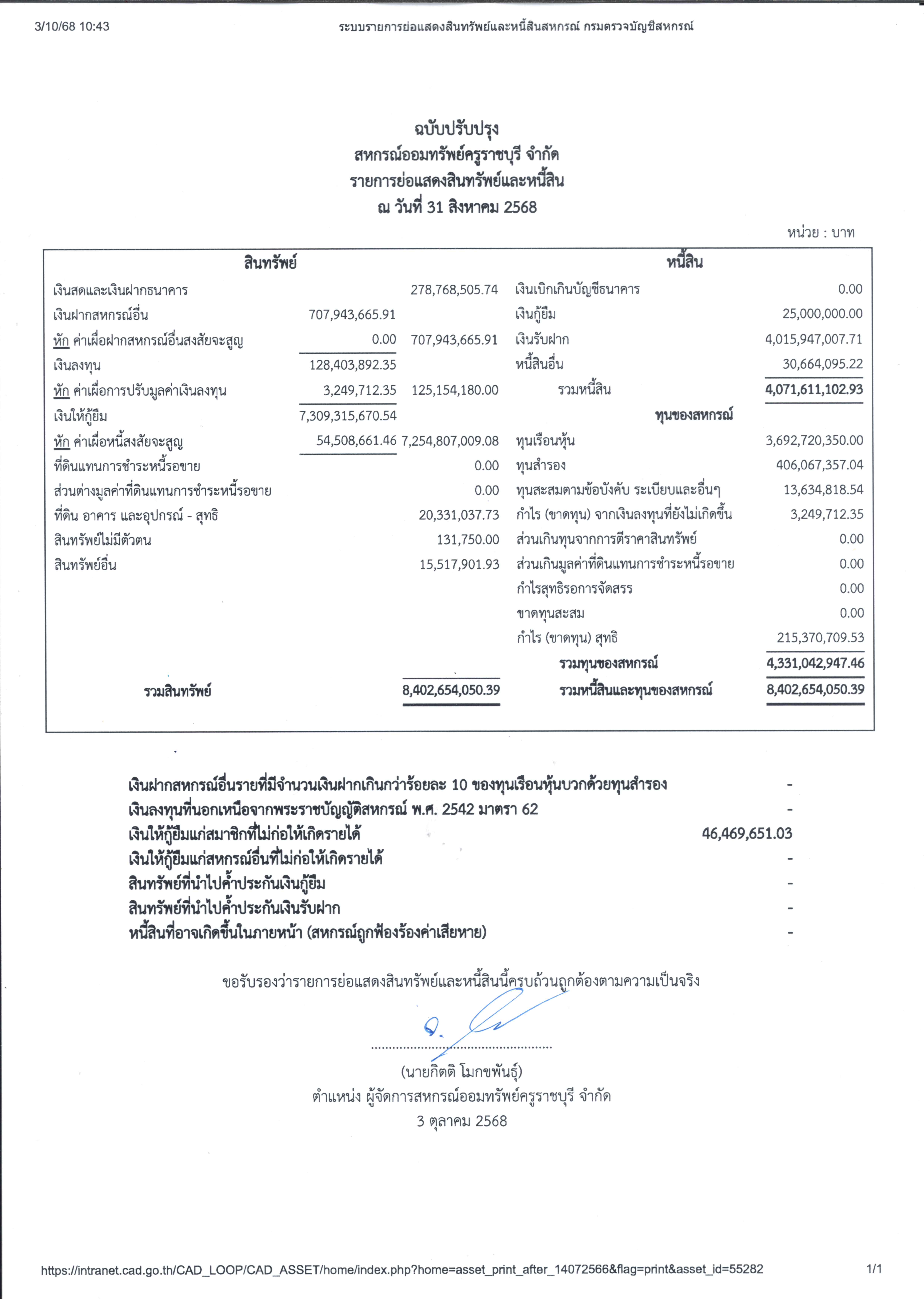 รายการย่อแสดงสินทรัพย์และหนี้สิน ประจำปีบัญชี 2567 สหกรณ์ออมทรัพย์ครูราชบุรี จำกัด ในเดือนต่างๆ |